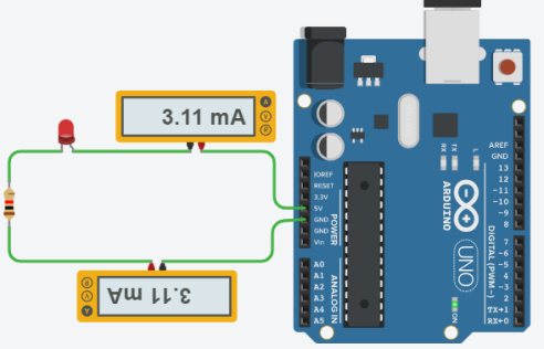 La tension est la différence de potentiel entre les bornes d'un composant. On peut simplifier en l'assimilant à la force avec laquelle sont poussées les électrons dans le composant. On mesure la tension d'un composant dans un circuit avec un voltmètre. Celui-ci est branché aux bornes du composant (en parallèle). L'unité est le Volt (V). Dans notre circuit, la somme des tensions aux bornes des différents composants est égale à la tension aux bornes du générateur (ici l'Arduino).