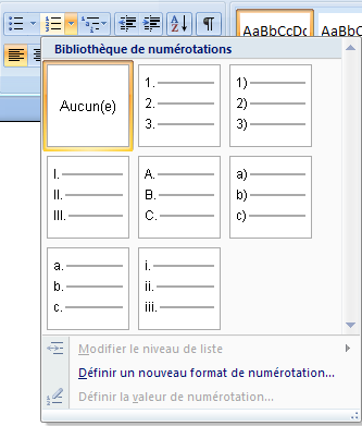 L'onglet numérotation permet de faire une liste numérotée, la liste déroulante permet de choisir un autre style de numérotation