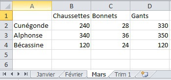 Excel permet de faire des calculs sur des ensembles de feuilles comme si elles étaient superposées.