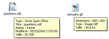 Des propriétés générales : nom, type, taille, date de création, date de dernière modification, ...